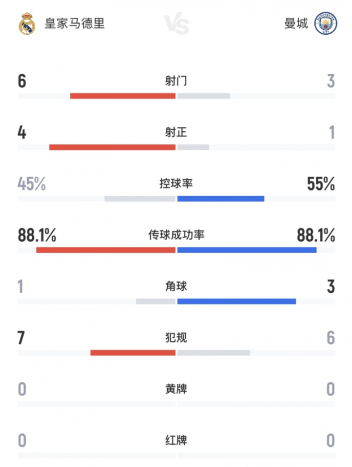 皇马上半场6次射门4次射正打进3球2025年正规长沙配资平台,曼城3次射门1次射正。